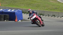 The afternoon consisted of timed riding sessions of about 15 minutes followed by hanging out for half an hour while the other two more advanced groups went out on the track. There was an afternoon classroom session for those wanting to get certified for their racer's license, but I chose to spend more time riding instead. I snagged the John Donald, the riding instructor who had lead me around in the morning, for some personal critique. He seemed to typify the Penguin instructor: extremely nice, eager to help, incredibly enthused about racing, and basically a blast to be around. He helped straighten me out in a couple of spots where I had gone off line and generally helped me to understand what I should be looking for. I asked him about getting my knee down on the ground in the turns, something I was desperately eager to do but hadn't yet managed. I don't remember exactly what he said, but whatever it was, it was very reassuring and made me feel comfortable with the pace I was going and what I was doing. It was with great satisfaction that during my next session on the track I heard the tell tale scrape of my knee pucks sliding across the asphalt.