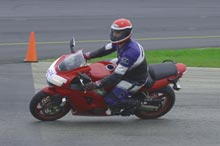 The highlight of my rainy day was definitely the next exercise. Penguin has a Yamaha TTR125 fitted with street tires which allow you to experiment with loss of traction, the theory being that in a parking lot at slower speeds (where a crash is unlikely to have serious negative consequences), you can learn to slide both the front and rear wheel safely. This is preferable to trying to learn to slide a bigger bike on the track at higher speeds where the possibility of major damage to you and your bike is high. Unfortunately, it was explained to me that the rain pretty much shot the theory to hell, and basically, all we were going to end up doing was crashing. One of the other students had brought a Honda XR100 for the same purpose and was merrily crashing away in the rain. When she was ready for a break, she asked me if I wanted to try it, so out I went. It turned out to be harder to crash then I had imagined. With the light weight, serious lack of power, and decent rain tires, I had to resort to insane lean angles to get the thing to topple. When I finally did crash, it provoked a giddy feeling as I knew I was doing no harm. I certainly got used to feeling my knee puck scraping along the ground during this exercise. What an absolute blast. Not the most fun I have ever had on a motorcycle (that is reserved for the previous day's track riding), but close.