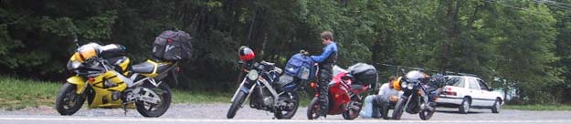 From New York City to Cleveland, Georgia and back by Motorcycle Way back in 1989, I traveled across the country on motorcycle. It was a seminal experience for me. One of the best things about the trip was riding Skyline Drive, the upper portion of the Blue Ridge Parkway. One of the worst things was the fact that two of my best friends from high school, Adam and Zac Zimmerman, both avid motorcyclists, were unable to accompany me. The idea of returning to motorcycling in the Southeast has been camped out somewhere in the wilderness of my mind, slowly percolating ever since. About 7 years ago at the New York Auto show I bought "Extreme Twisties", a self published spiral bound book with over a hundred separate detailed routes in the southeast for motorcycle and car, and twice I have ordered small local guides to motorcycling in North Carolina. I first decided I must visit Deal's Gap about four years ago when I came across a website about it, but it was during a mountain bike trip to West Virginia two years ago where, stuck in an underpowered Subaru, I realized I was really going to have to come back to the region on a motorcycle. Making good use of the previously mentioned reference material and the internet, I planned a trip from New York City down through the twisty mountain roads of Virginia, West Virginia, North Carolina, Tennessee, Georgia and even a little bit of Ohio. This time Adam and Zac were going to accompany me. Adam even shipped his motorcycle from L.A. so he could come. Joined by Matt Goodell, another friend of mine from college, the four of us set out on a nine day adventure covering over 2700 miles of some of the best motorcycling roads in the US. The following links to each day have pictures, notes, accommodation info but most importantly, directions in case you want to try it yourself. Directions for the entire trip. Interested in what we thought about the gear we used? Click here. |